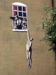 Imaginea unui sobolan cu foarfeci, ce taie platforma suspendanta a artistului. Sobolanii sunt, de asemenea, favoritii lui Banksy, acesta folosindu-i ca mecanisme amuzante pentru a scoate la iveala probleme serioase. Aceasta este mai mult o imagine gluma, gasita pe strada Canal si West Broadway.