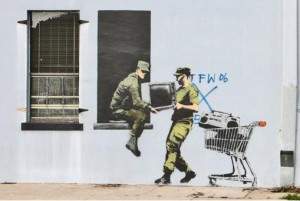 In 2005, Banksy a realizat o serie de imagini pe zidul de beton israelian ce reprezinta o bariera de securitate (in termeni diplomatici), ca protest impotriva constructiei acestuia. Imaginile sunt pe partea palestiniana a zidului si includ reprezentari a ‘cum ar putea fi viata in cealalta parte a zidului’. O parte din lucrari au fost inalturate. Banksy a spus ca soldatii israelieni au indreptat armele inspre el in timp ce lucra.