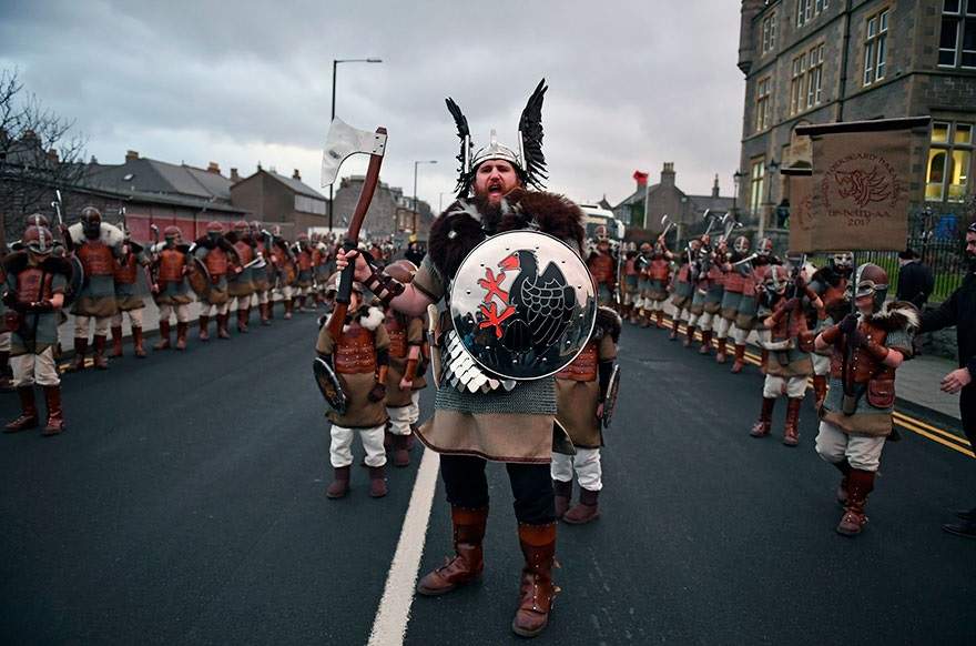 Up Helly Aa este un festival legendar al vikingilor care are loc in fiecare an in Scotia, transmite Toxel.ro. Editia din acest an a fost de-a dreptul epica. Un grup de vikingi cunoscuti sub numele de Jarl Squads, condusi de liderl lor Guizer Jarl, au mers o zi intreaga prin Lerwick, capitala provinciei Shetland, etalandu-si costumele spectaculoase si manifestandu-se in maniera caracteristica. Destinatia finala a fost portul unde ii astepta o nava inconjurata de 1000 de torte aprinse, menita sa ii duca spre centrul orasului pentru a-si petrece restul noptii cu multa bere si voie buna.