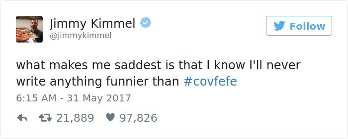 Comediantul Jimmy Kimmel, intristat de faptul ca nu va putea nascoci niciodata un cuvant la fel de amuzant precum "covfefe"