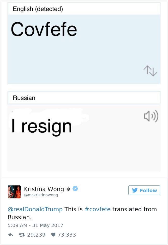 Internautii au elucidat misterul: covfefe inseamna "demisionez"... in limba rusa