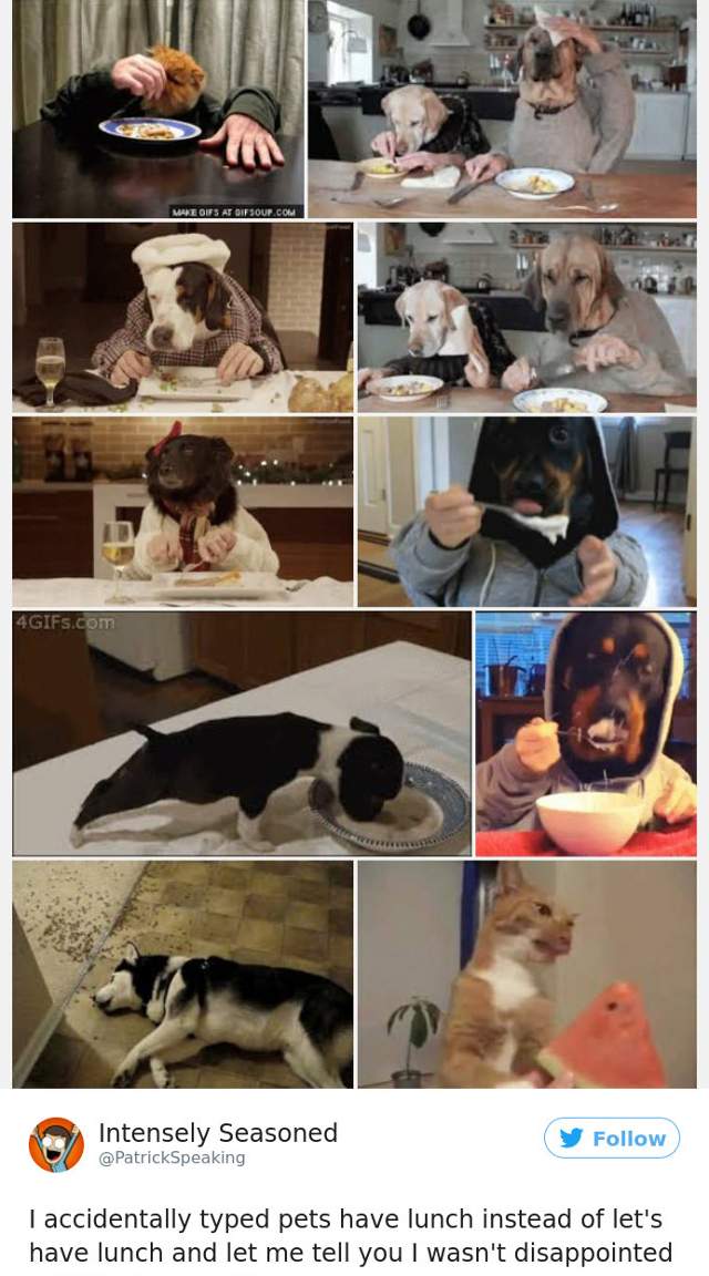 A tastat "pets have lunch" (cainii iau pranzul) in loc de let's have lunch (hai sa luam pranzul)