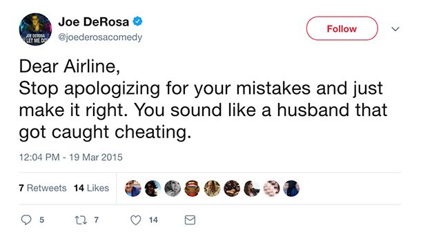 "Draga companie aeriana, inceteaza sa-ti mai ceri scuze pentru greseli si incearca sa faci lucrurile asa cum trebuie. Parca esti un sot care a fost prins inseland", a scris Joe de Rosa pe aceeasi retea de socializare.