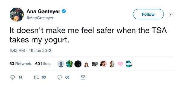 list25.com, actrita Ana Gasteyer are plangeri la adresa Administratiei de Securitate a Transporturilor: