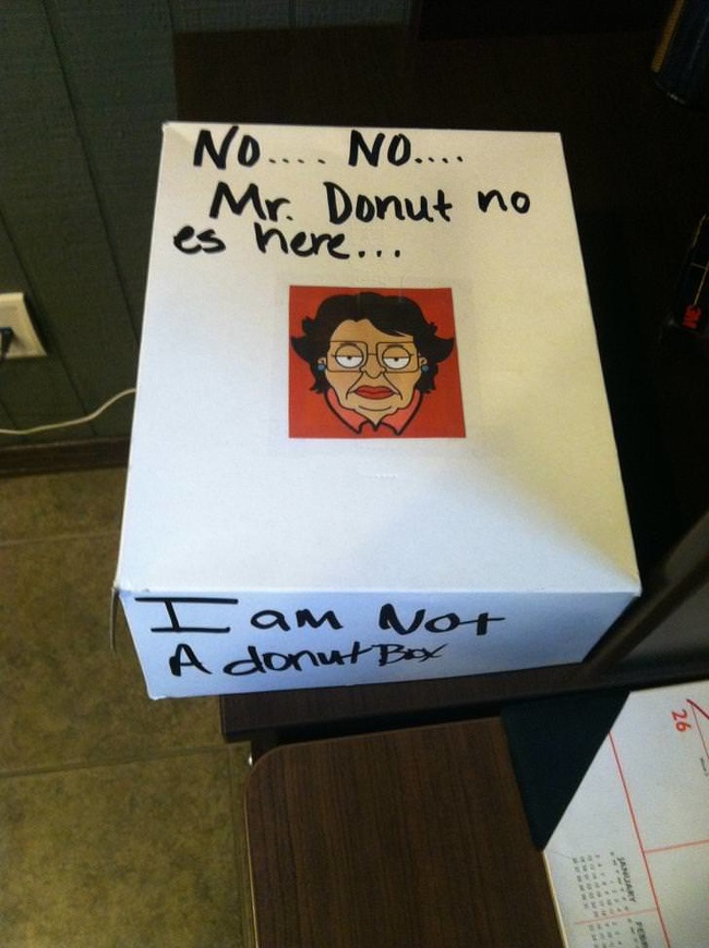 S-a saturat sa deschida toata lumea cutia, sperand ca va gasi gogosi inauntru si a scris pe ea un mesaj clar: "Nu sunt o cutie de gogosi!"