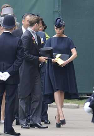 Ducesa de Cornwall a purtat o tinuta semnata Anna Valentine, compusa dintr-o rochie de matase, de culoarea sampaniei, asortata cu palarie de aceeasi culoare si un sacou cu broderie.