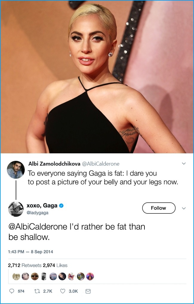 Lady Gaga este una dintre cele mai controversate vedete din lume, iar acesta nu mai este un secret pentru nimeni. In ultima perioada, cantareata a luat cateva kilograme in greutate, lucru de neiertat in opinia unora. Pentru ei, Gaga a avut o replica scurta, pe pagina sa de Twitter: "Mai bine grasa decat superficiala".