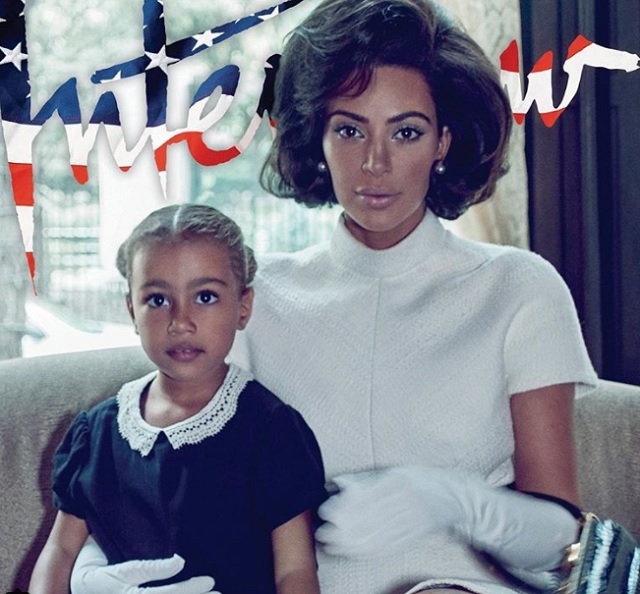 Kim Kardashian si-a impresionat fanii in august, cand a postat o fotografie cu ea, "deghizata" in Jackie Kennedy, in care aparea alaturi de fiica sa. Multi nu au privit cu ochi buni fotografia: unii au fost de parere ca vedeta si-a inchis tenul mult prea mult, pentru a ascunde complexul fiicei sale, iar altii au spus ca nu se poate compara cu fosta Prima Doamna.