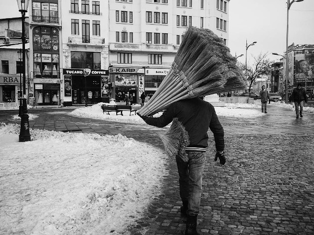 Fotografia este realizata in luna februarie, intr-o zi geroasa. Barbatul din imagine pare inarmat cu arsenalul ideal pentru a curata toata zapada.