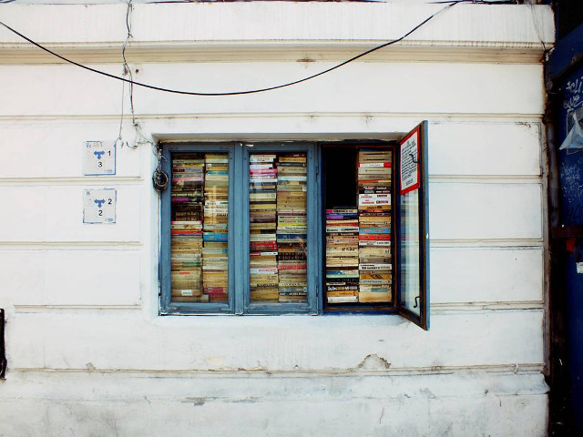 Aceasta fereastra de pe strada Batistei, plina cu carti, este un anticariat vechi de ani de zile. Domnul care se ocupa de el locuieste acolo si ofera cateva carti pe care nu le mai gasesti in niciun anticariat din Bucuresti.
