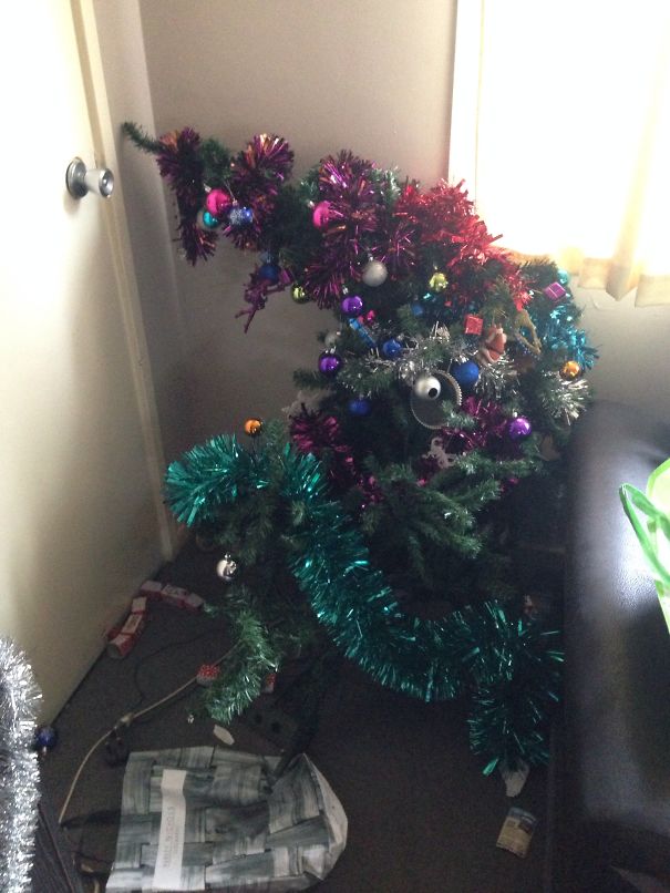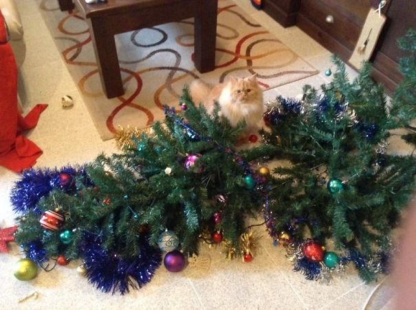 Daca, intr-un articol precedent, am vazut ce masuri putem lua pentru ca animalul de companie sa nu distruga bradul de Craciun, este cazul sa vedem si ce intampla atunci cand... nu facem nimic. Evident, orice aranjament pregatit cu grija este distrus, dupa cum putem vedea si in imaginile de mai jos.