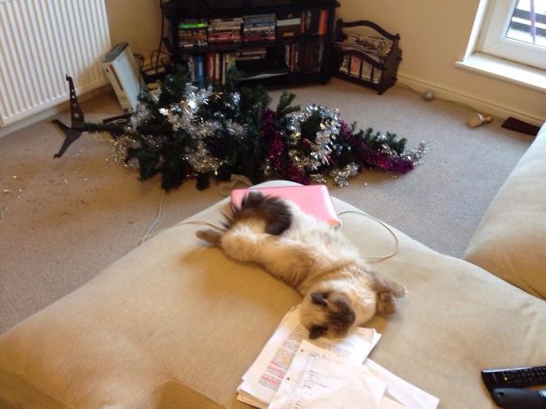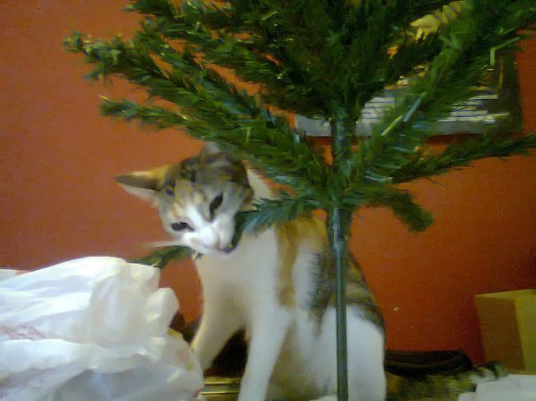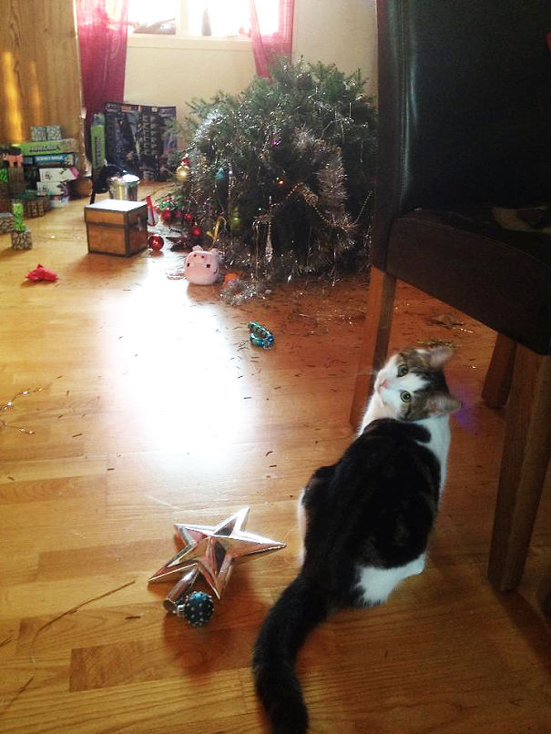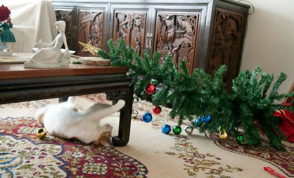 Daca, intr-un articol precedent, am vazut ce masuri putem lua pentru ca animalul de companie sa nu distruga bradul de Craciun, este cazul sa vedem si ce intampla atunci cand... nu facem nimic. Evident, orice aranjament pregatit cu grija este distrus, dupa cum putem vedea si in imaginile de mai jos.