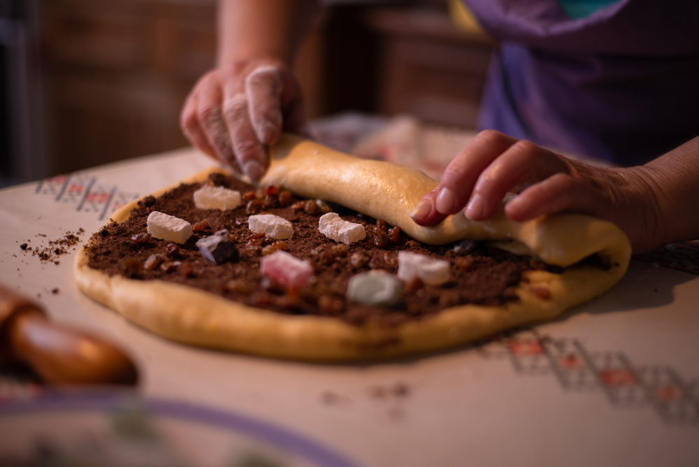 Pentru umplutura de cozonac bate albușurile spumă, apoi se adaugă câte puțin zahărul, până se obține o bezea fermă și lucioasă. Amestecă bezeaua obținută cu restul ingredientelor, nuca, esența de rom, cacao și stafidele. După ce aluatul a crescut, împarte-l în 4 bucăți egale sau în 6, în funcție de dimensiunea tăvilor în care vei coace cozonacii. Unge masa cu ulei și întinde o foaie de aluat cu ajutorul mâinilor ușor înmuiate în ulei. Întinde umplutura de nucă pe întreaga suprafață a foii de aluat, rulează ușor apoi procedează la fel și cu următoarea.