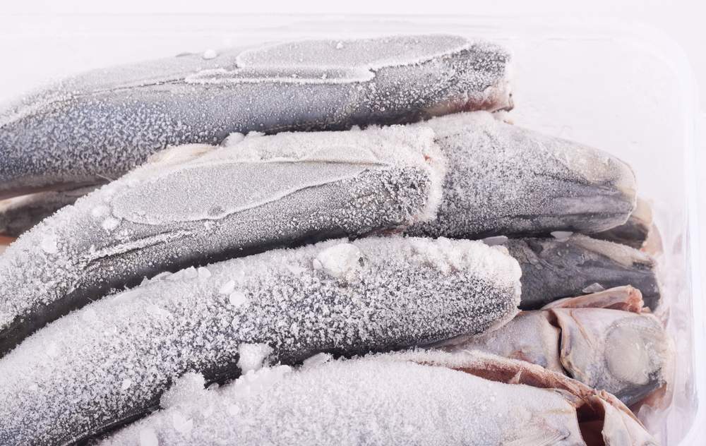 Volumul stratului de gheață nu trebuie să fie mai mare de 5% din greutatea peștelui. Din păcate, acest aspect se poate vedea de multe ori în magazine. Nu uita să verifici cu atenție peștele, iar dacă observi fisuri pe gheață, atunci există cu siguranță mai mult de 5% gheață pe pește. Bonus: Dacă gheața este galbenă, înseamnă că peștele nu este proaspăt!