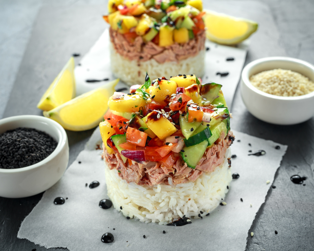 Tonul este bogat în acizi grași omega 3. De asemenea, previne formarea grăsimii în zona abdominală. Ghimbirul îmbunătățește funcția intestinului și previne balonarea. Așadar, nu ar trebui să te oprești niciodată din răsfățul cu o salată cu ton sau cu o porție de sushi proaspăt preparate! Dar ferește-te de sosul de soia, acesta conține prea multă sare.