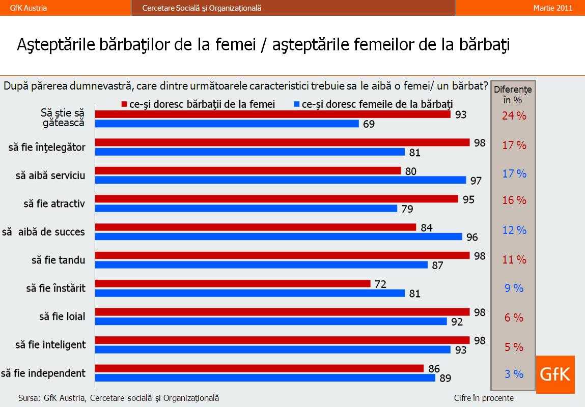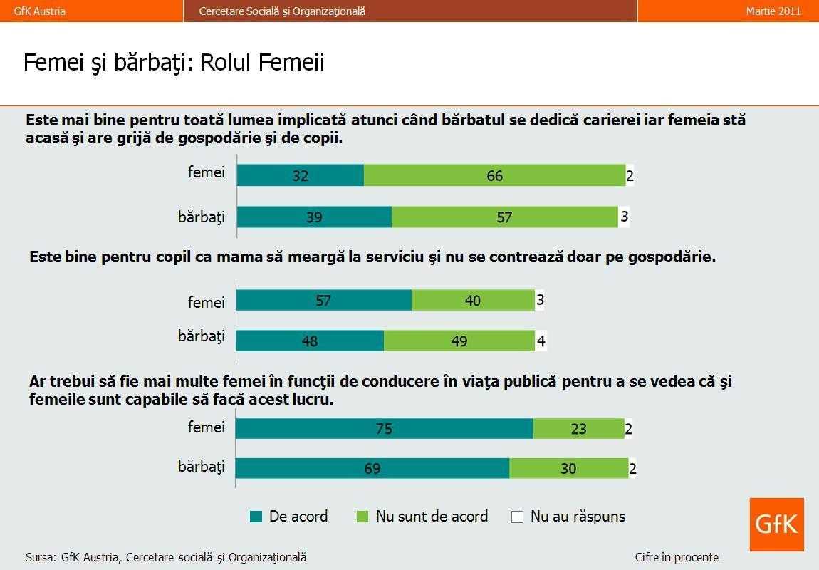 Comparativ, este mai putin important pentru barbati ca femeile sa fie de succes (84%), sa fie instarite financiar (72%), independente (86%) si sa mearga la serviciu (80%) - chiar daca se observa ca majoritatea barbatilor considera si acest lucru ca un aspect de dorit care face parte din a fi femeie azi. Cu alte cuvinte: