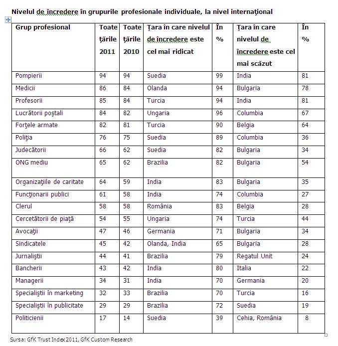 Serviciul de pompieri continua sa se bucure de cel mai inalt nivel de incredere pe plan international, in timp ce reputatia organizatiilor de caritate si cea a judecatorilor a inregistrat o imbunatatire considerabila, arata studiul "GfK Index Trust 2011", efectuat in 19 tari de catre divizia GfK Custom Research.