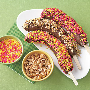 Curatati bananele de coaja si infigeti in fiecare dintre ele cate un bat pentru inghetata. Topiti ciocolata neagra intr-o craticioara, la foc mic. Lasati-o la racit si dupa ce temperatura sa a scazut, glazurati bananele cu ciocolata topita. Infigeti-le, rand pe rand, intr-o bucata de polistiren expandat sau intr-un burete pentru ca glazura sa nu se strice. Presarati deasupra lor alune pisate si ornamente colorate din zahar.