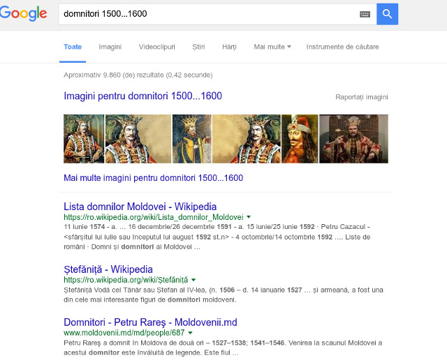Foloseste trei puncte, "..." pentru a reduce o anumita perioada de timp. De exmplu, daca vrei sa gasesti domnitorii din perioada 1500-1600, tasteaza in motorul de cautare "domnitori 1500...1600".