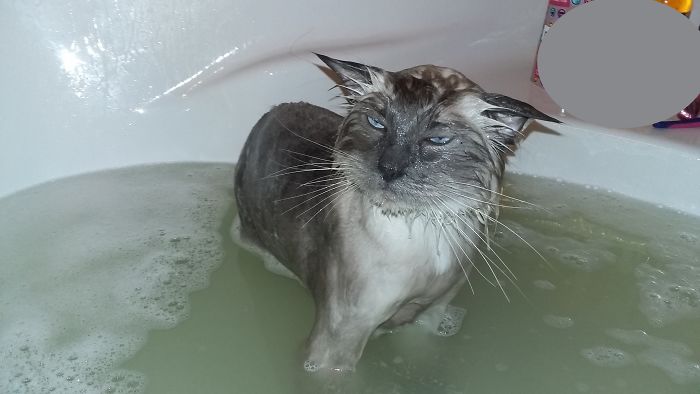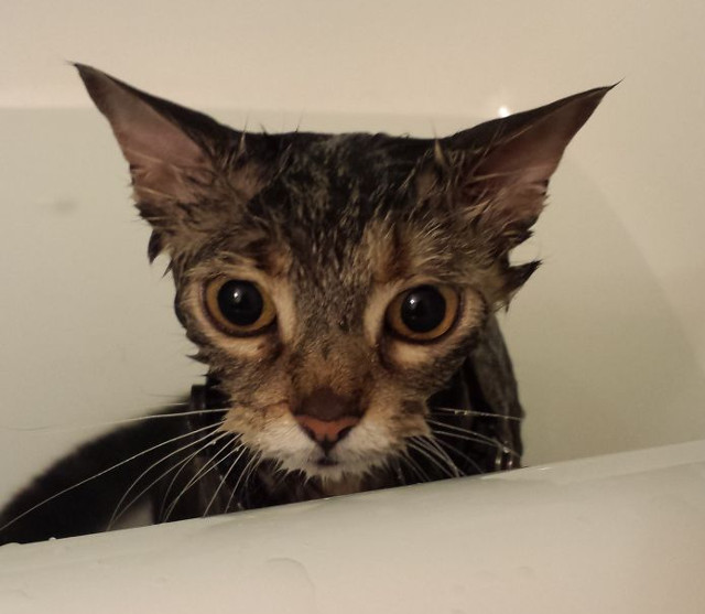 O pisica ce, probabil, pune la cale un plan de razbunare impotriva stapanilor care au spalat-o