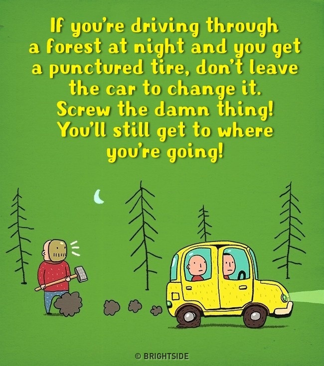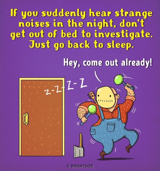 Te sperii la filmele horror si iti imaginezi apoi ca personajele pot aparea... in viata reala? Sau ti se pare ca auzi zgomote ciudate din dulap? Fara a mai preciza faptul ca totul este in mintea ta, poate ar trebui sa si sa privesti lucrurile dintr-o alta perspectiva. Una mult mai amuzanta, in care personajele negative nu sunt deloc atat de malefice precum iti imaginai. Site-ul brightside.me a publicat cateva ilustratii care, speram noi, va vor ajuta sa scapati de teama filmelor de groaza.