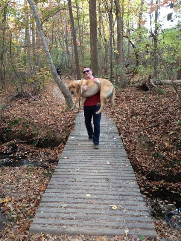 Traversarea podului il sperie de moarte pe acest caine, asa ca stapanul s-a adaptat si il cara in brate