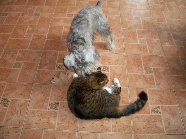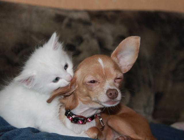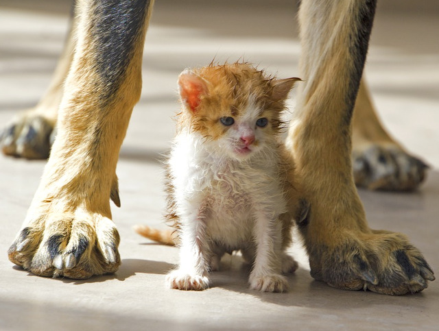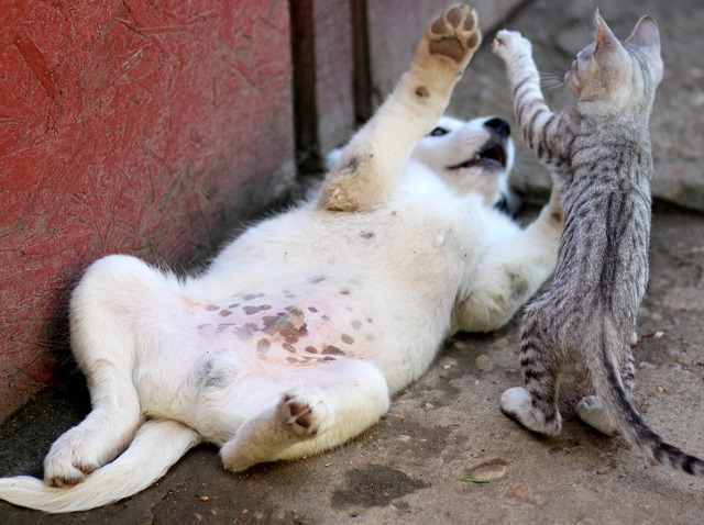 De multe ori vedem caini care reactioneaza urat atunci cand o pisica le apare in cale. Se pare, insa, ca nu este si cazul celor din imaginile de mai jos.