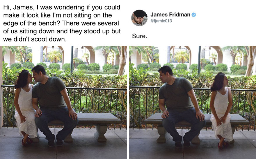 James Fridman, un expert in Photoshop foarte cunoscut in mediul virtual, a decis sa isi puna talentul in slujba oamenilor. El accepta cereri de la diferite persoane care ii cer sa le imbunatateasca aspectul si publica, pe pagina sa de Facebook, rezultatul. Insa, nu intotdeauna "operele" sale sunt pe placul solicitantilor, dar cu siguranta aduc un zambet pe buze oricui. Pentru mai multe astfel de imagini, puteti urmari pagina de Facebook a lui James Fridman.
