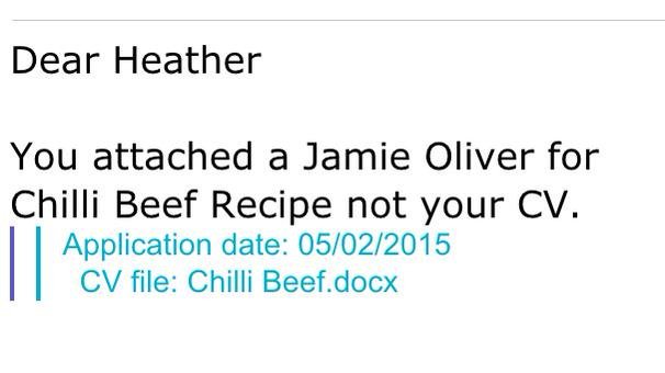 Ai atasat o reteta de chili cu carne de vita a lui Jamie Oliver in loc de CV".