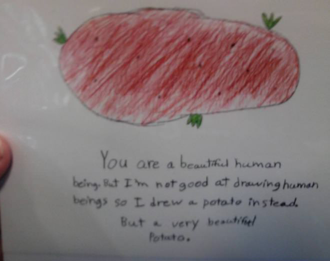 Asa incepe mesajul unui copil, care se pare ca nu se pricepe se deseneze oameni, ci doar cartofi. "Insa un cartof foarte frumos", precum explica.