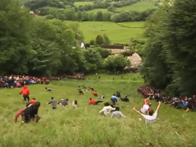 Ne intoarcem in Marea Britanie, unde are loc aceasta curioasa si periculoasa competitie de alergat pe un deal abrupt dupa o bucata de branza. Pe cat de ciudat este acest concurs, pe atat de multi atrage de fiecare data. Lucurile se desfasoara foarte simplu: cea mai rapida persoana care ajunge la baza dealului castiga bucata de branza.