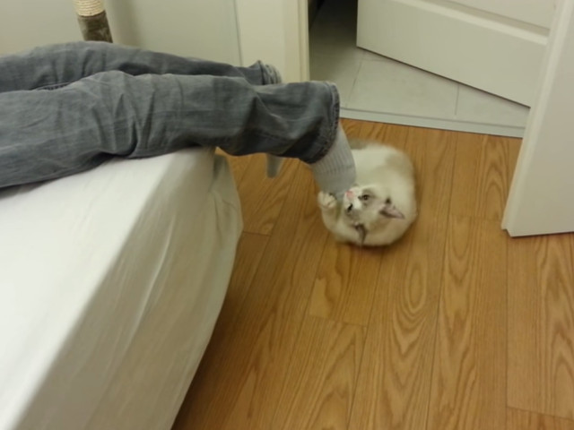 Aceasta este una dintre cele mai ciudate si amuzante reactii ale unei pisici cand stapanul isi insceneaza moartea. Nazdravana felina nu face altceva decat sa se joace cu piciorul stapanul, iar cand se plictiseste se spala indiferenta.