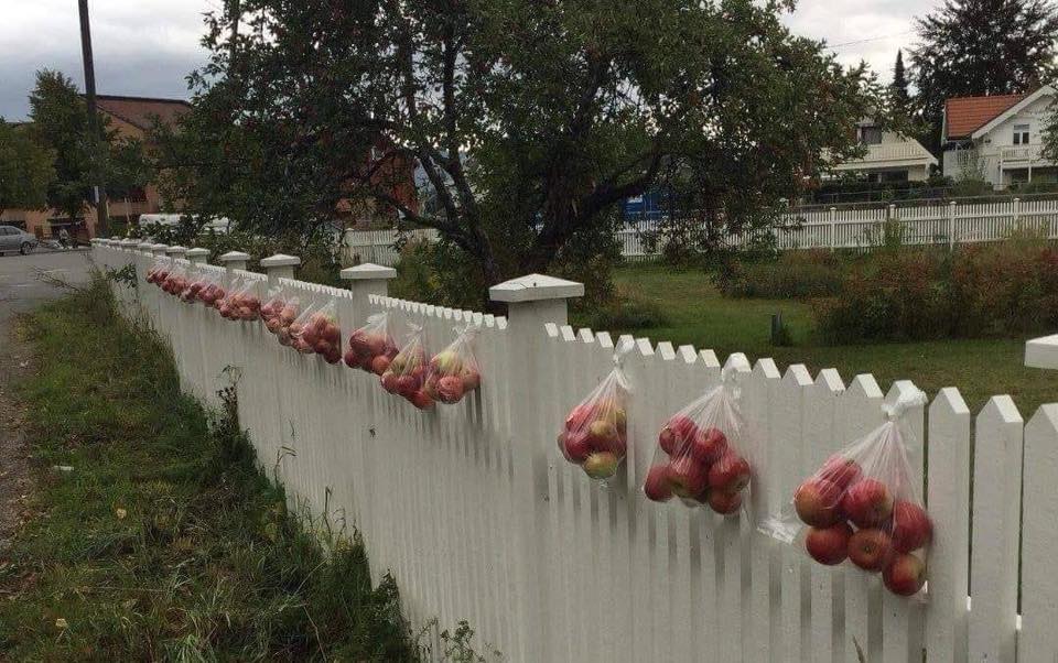 In perioada in care se culeg merele, oamenii din Norvegia agata de gardul curtii lor pungi cu mere. Acestea sunt disponibile pentru oricine vrea sa le ia, gratis.