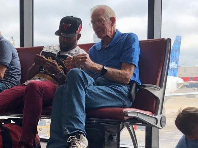 Intr-o zona de asteptare a aeroportului, acest barbat mai in varsta il invata pe tanarul de langa el cum sa faca origami folosind o bancnota de un dolar.