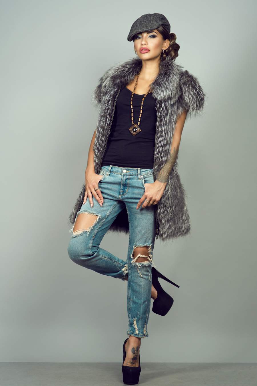 Blugi boyfriend, vesta midi si pantofi cu toc