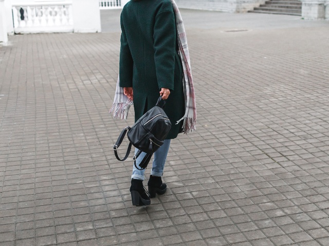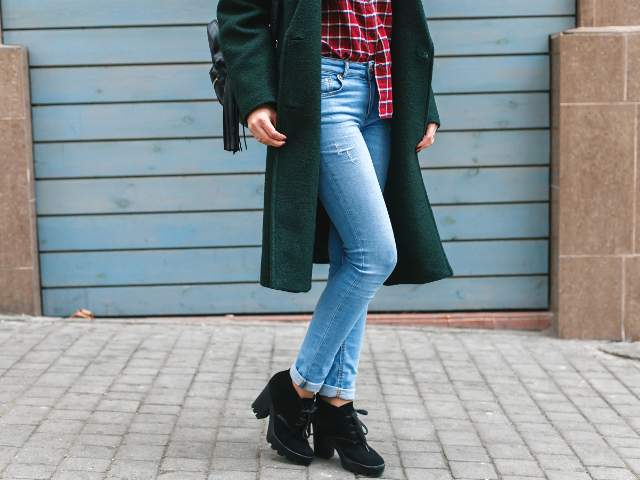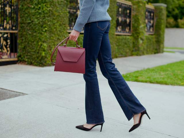 Blugi evazati cu pantofi cu toc si o geanta colorata