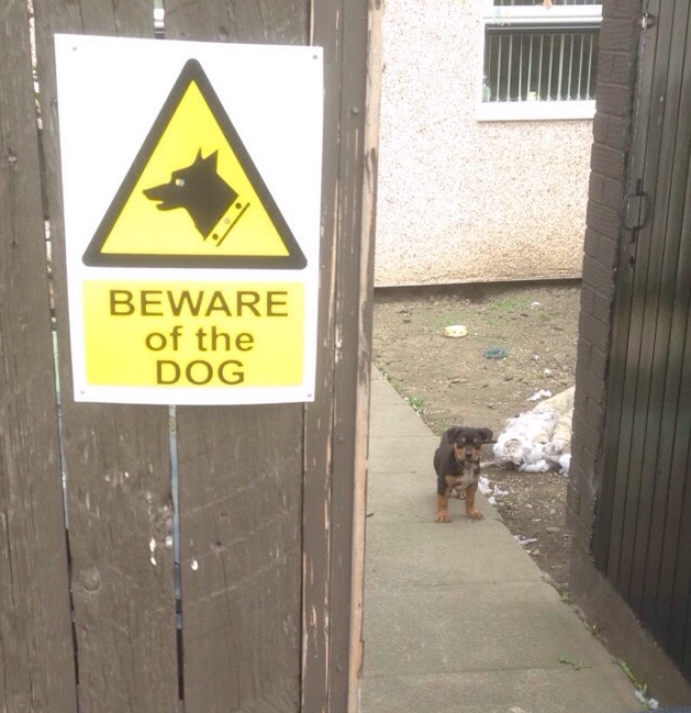 "Stai departe de caine. Intri pe riscul tau". Risc de a dori sa il iei acasa, cel mai probabil.