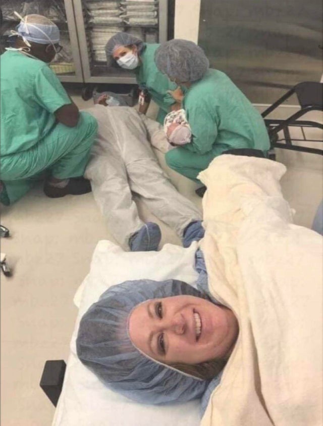 Sotul ei a mers in sala de nasteri pentru a o inveseli. Rezultatul, in imagine