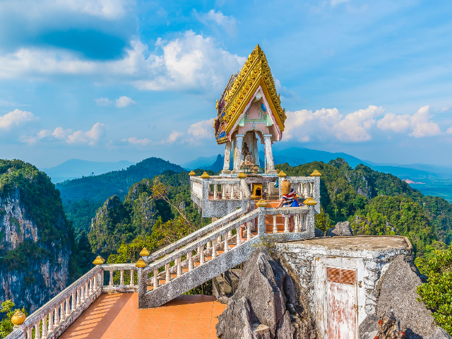 Krabi, una dintre cele mai frumoase regiuni din Thailanda, unde preturile la cazari pornesc de la 650 de euro pentru o saptamana, cu mic dejun inclus. Persoanele care tanjesc dupa relaxare, soare, surfing se vor simti cel mai bine aici. In plus, aici te poti lasa incantat si de Pestera Tigrilor- Wat Tham Seua, un templu complex ce este situat in apropiere, la aproximativ 7 km nord de Krabi. Pentru a ajunge la lacasul de cult se urca 1200 de trepte, insa efortul va merita din plin pentru privelistea care iti va taia rasuflarea.