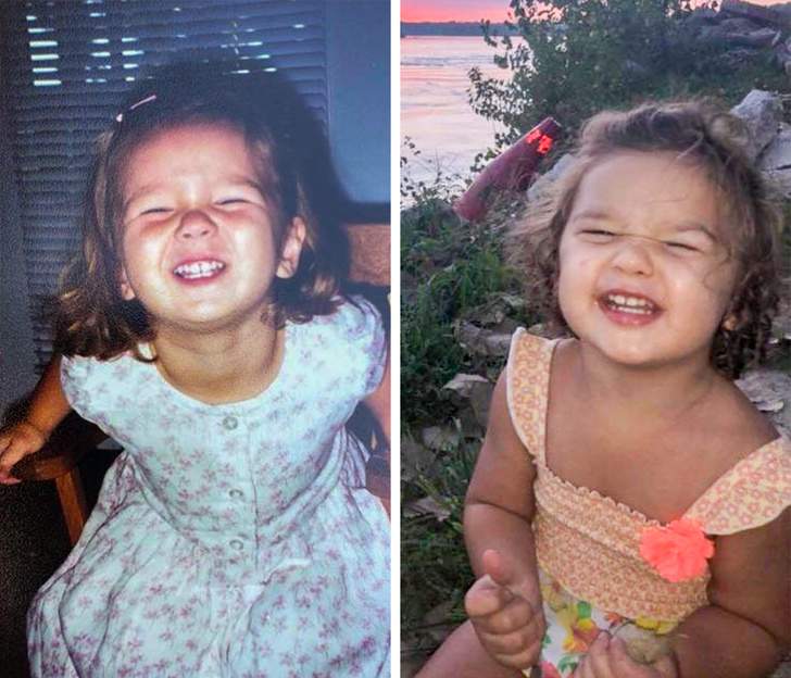 "Fiica mea la doi ani, in 1998 (stanga) si nepoata mea la doi ani, in 2019 (in dreapta)"