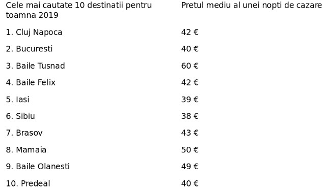 Toamna obisnuieste sa vina cu proiecte noi sau modificari in joburile romanilor, dar nostalgia isi face simtita prezenta si cere dreptul la cateva zile de plimbari in afara oraselor pentru a admira culorile specifice anotimpului. Dar pentru ca cei mai multi romani au cheltuit deja economiile in timpul vacantei de vara, lista prezentata ii va inspira sa calatoreasca fara grijile financiare aferente. Iata care este, potrivit motorului gratuit de cautare pentru calatorii momondo.ro, evolutia preturilor si a cautarilor de cazare in locatiile din Romania pentru lunile septembrie - noiembrie 2019.