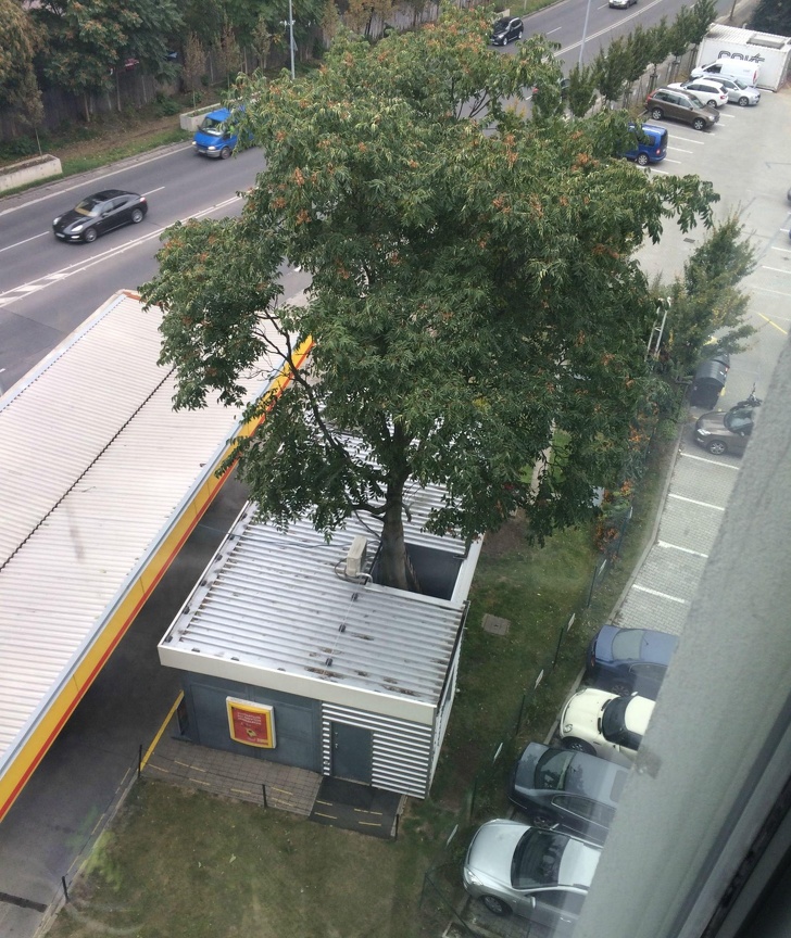 Nu vezi in fiecare zi un copac care creste din interiorul unei benzinarii