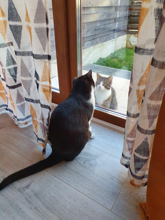 A mieunat intr-o zi la pisica vecinului, iar acum ea vine in vizita mereu