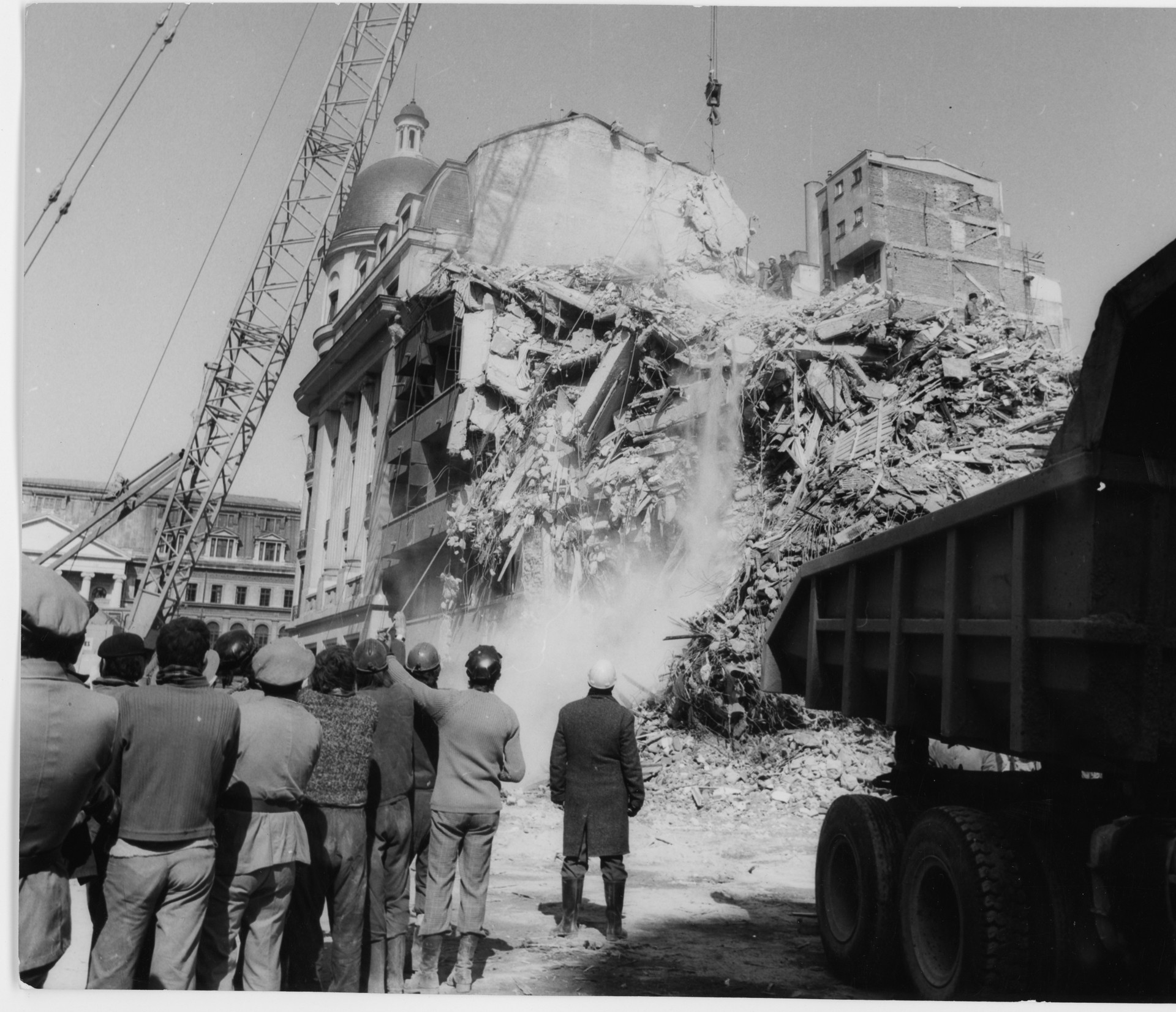 Aflat la intersectia strazilor Arghezi (actuala Dionisie Lupu) si C.A. Rosetti, blocul ce purta numele poetului s-a prabusit aproape in totalitate. In imagine sunt surprinsi militari intervenind in zona ruinelor, pentru gasirea supravietuitorilor.
