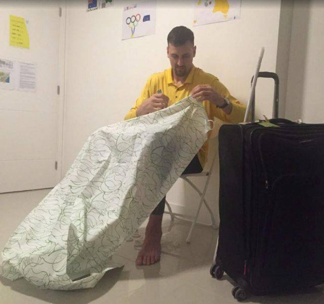 Baschetbalistul australian Andrew Bogut a avut parte de o situatie inedita, chiar dupa ce a ajuns in camera sa de la Rio. Atletul a publicat pe Twitter o fotografie in care arata cum isi confectioneaza o perdea de dus din perdeaua pe care o avea in camera.