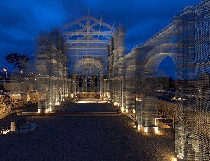 Biserica realizată din tije de metal, parcă scoasă din realitatea augmentată