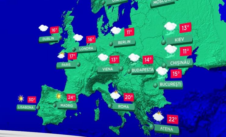 În Europa, ziua de mâine se anunță rece, mai ales în nord-vest, centru și prin sud-est, pe unde norii vor fi mulți. Față de ploile abundente așteptate în sud-estul continentului, cele din partea centrală vor fi mai slabe și pe suprafețe mici. În contrast cu vremea din aceste regiuni va fi cea din Peninsula Iberică, pe unde se vor înregistra cele mai ridicate temperaturi, iar cerul va fi senin. 34 de grade Celsius vor fi la Lisabona și 24 în Madrid.