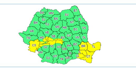 În Dobrogea și în estul Munteniei vântul va avea intensificări, cu rafale în general de 55...65 km/h, iar în zona litoralului și a deltei de peste 70 km/h, potrivit ANM.