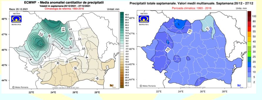 În nordul, centrul și vestul țării temporar vor fi precipitații, moderate cantitativ, iar cantitățile de apă, acumulate pe tot parcursul intervalului, vor depăși local 20...30 l/mp și izolat 40...50 l/mp, cu precădere în zona deluroasă și montană aferentă. În noaptea de joi spre vineri (23/24 decembrie) și în prima parte a zilei de vineri vor fi precipitații mixte în Crișana și pe alocuri în Banat și sud-vestul Transilvaniei, iar în Maramureș și local la munte, în Transilvania și în nordul Moldovei va ninge și se va depune strat de zăpadă. Pe parcursul zilei de vineri (24 decembrie) în zonele joase de relief precipitațiile se vor transforma treptat în ploaie, iar îndeosebi în noaptea de vineri spre sâmbătă (24/25 decembrie) și sâmbătă (25 decembrie), la munte, la altitudini mai mici de 1700 m, vor predomina ploile, determinând topirea stratului de zăpadă.