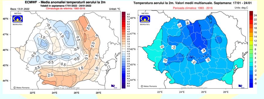 Sâmbătă, 15 ianuarie, temperaturile vor fi peste cele normale perioadei în aproape toată țara. Maximele vor fi cuprinse între 0 și 9 grade Celsius. La munte sunt anunțate precipitații slabe. Izolat vor fi și condiții de polei, iar vântul va sufla cu putere în majoritatea regiunilor. Duminică, 16 ianuarie, în nord, nord-vest și parțial în centrul țării, vremea va fi închisă și valorile maxime vor fi apropiate de cele normale pentru perioada în care ne aflăm. În celelalte zone, vremea va fi ușor mai caldă decât ar fi potrivit pentru mijlocul lunii ianuarie.